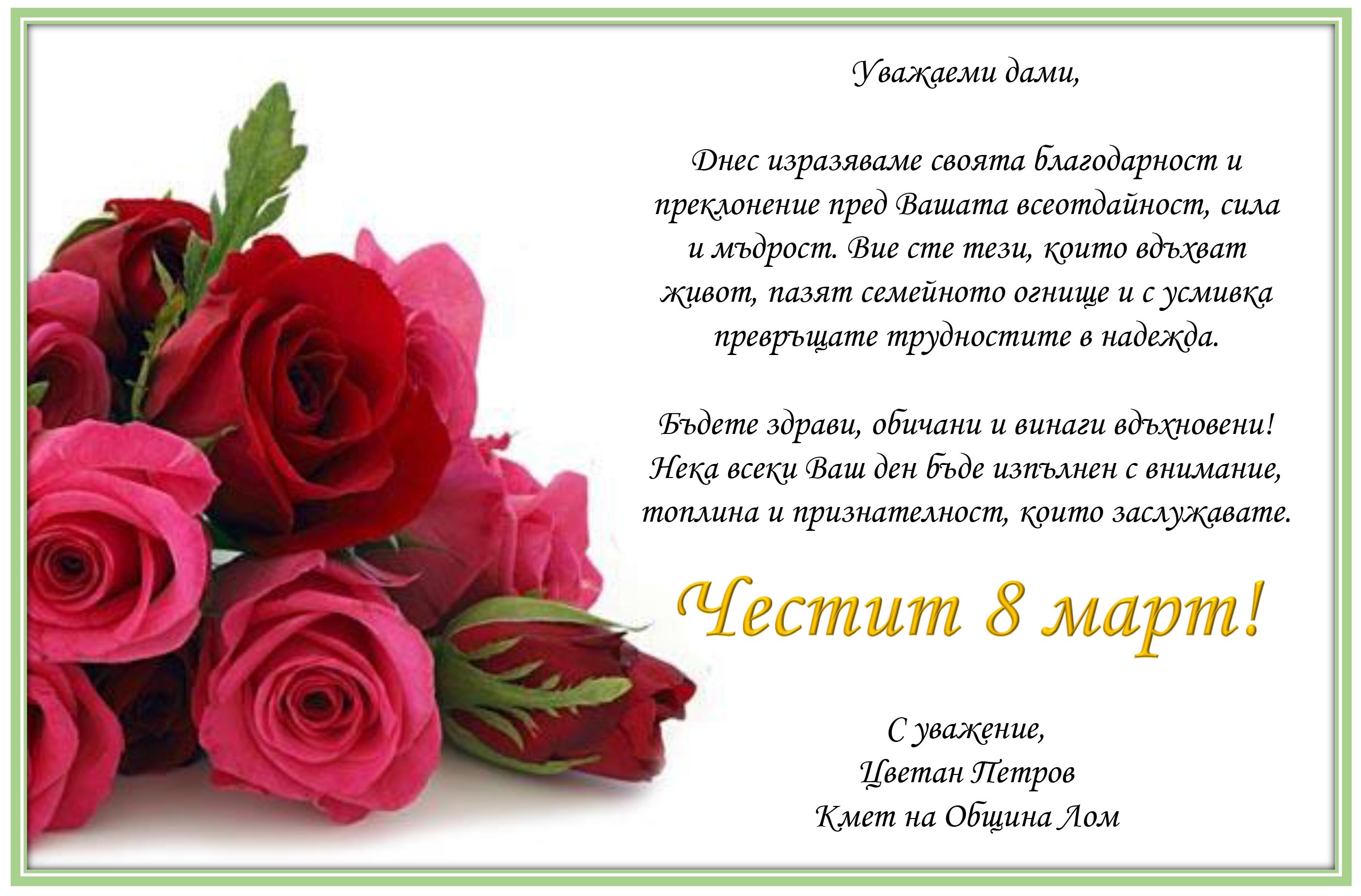 ПОЗДРАВИТЕЛЕН АДРЕС ОТ КМЕТА ЦВЕТАН ПЕТРОВ ПО ПОВОД МЕЖДУНАРОДНИЯ ДЕН НА ЖЕНАТА - 8 МАРТ