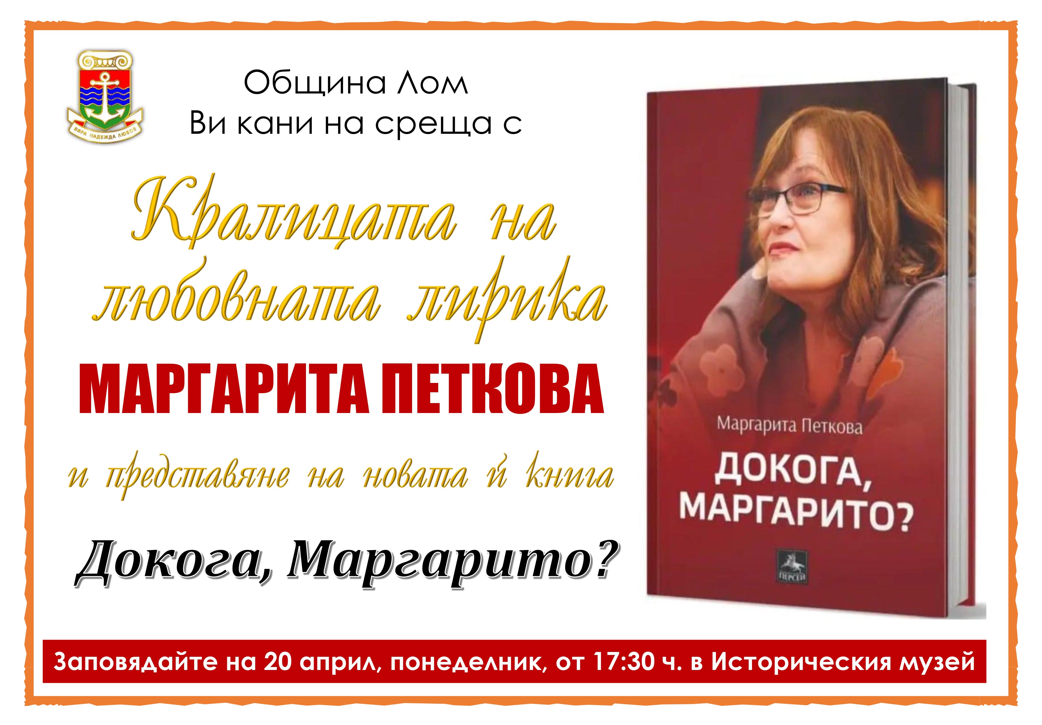 Кралицата на българската любовна лирика, голямата поетеса Маргарита Петкова, ще гостува в град Лом на 20 април. Пред ломска публика магнетичната авторка ще представи най-новата си книга със страстни стихове и откровения „Докога, Маргарито?“ на издателство „Персей“. В непринуден разговор с ломчани край старата театрална завеса от 1909 г. и сред уникалните артефакти на ломския Исторически музей Кралица Марго ще разголи душата си. За да разкрие своите голготи, бурни любови, разочарования, предателства и приятелства.